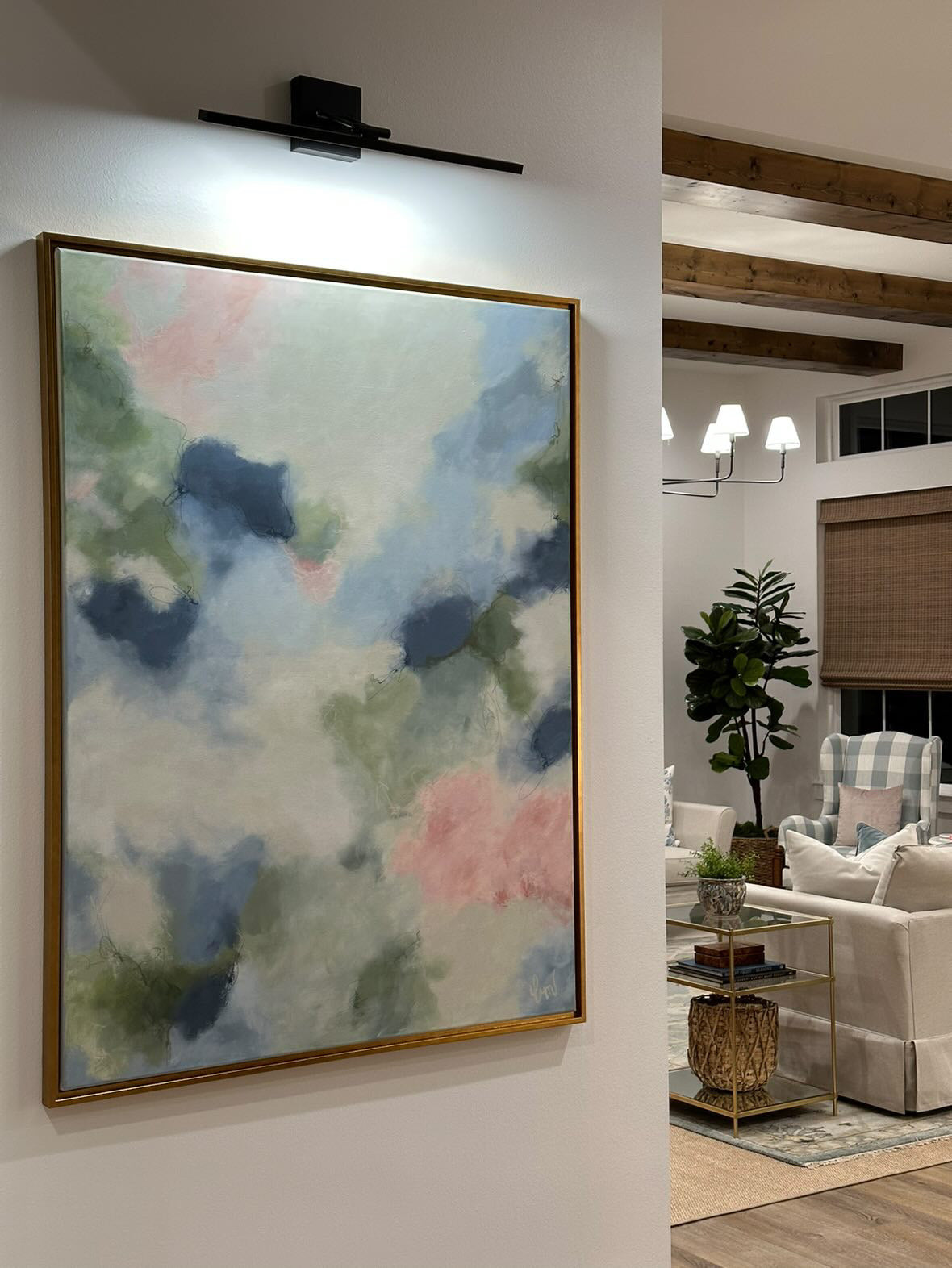 A custom 40x60 abstract art framed in gold floater completed for Oyster Creek Studio's client. Paint colors, fabric samples and pictures and video of the space your piece will be hanging always make for a seamless commission process.